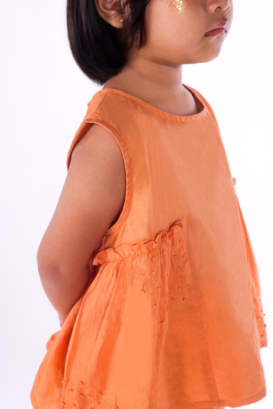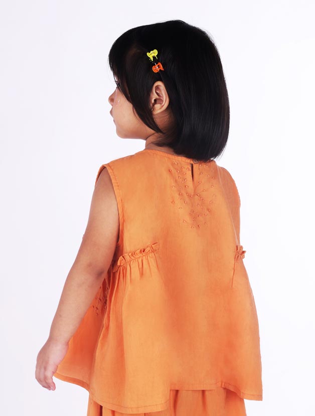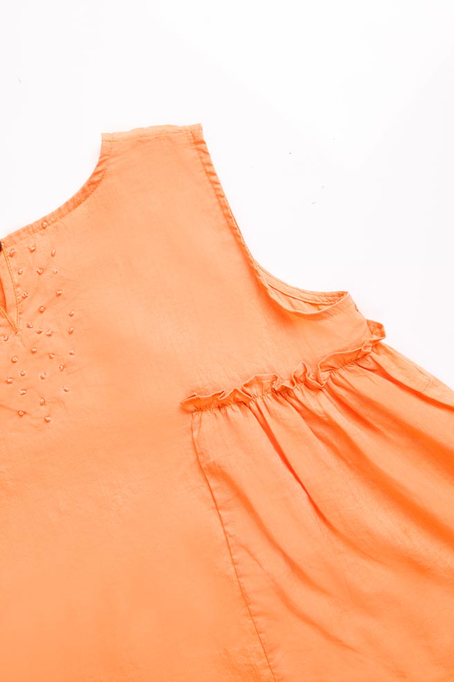 Step out in style, in our stunning HAILEY TOP with French knot embroidery on the frill panel on both sides in loose-fit, Sundail-color. The breathable weave ensures comfort on sunny days, the coconut button closure adds uniqueness, making it one of the best Organic children's wear options available online.