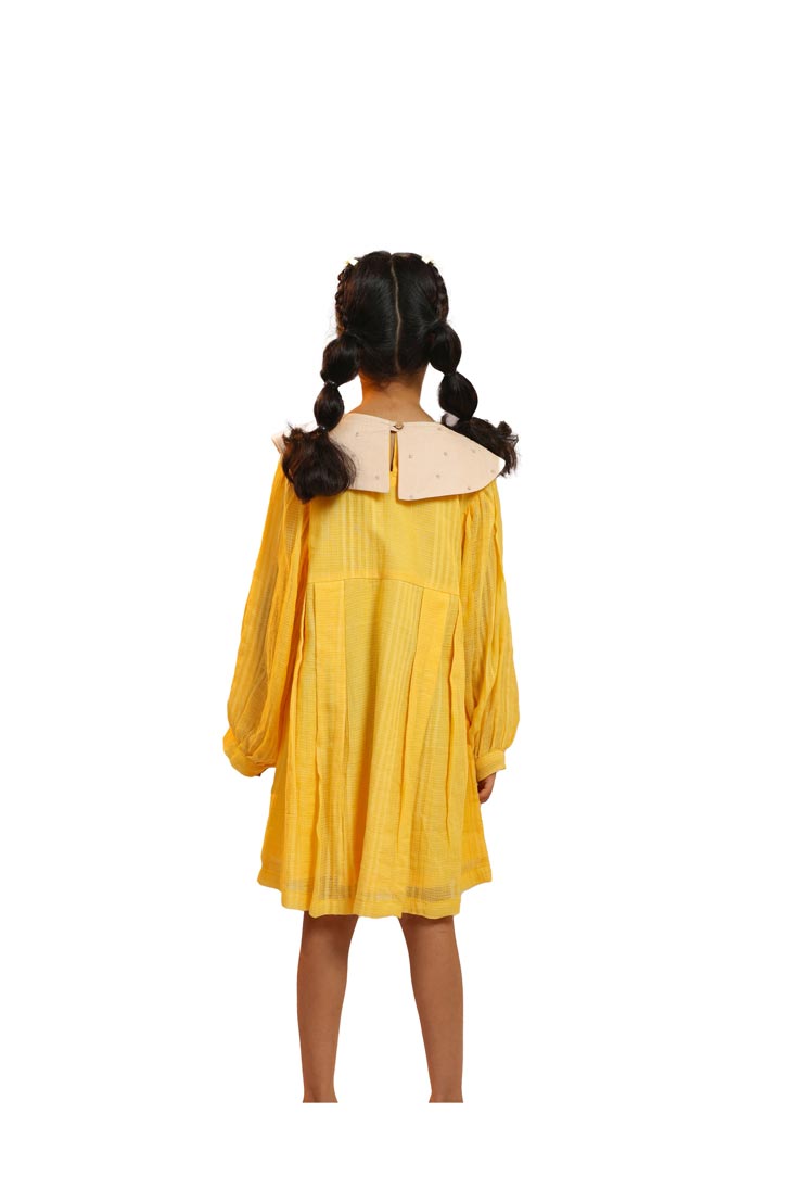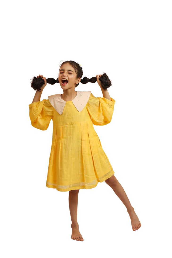 We all love Belle's yellow dress, that is why we are here with our YUGEN DRESS in Kota fabric, for your little princess. The dress, beautifully designed with puffed sleeves, pleated skirt and embroidered peter-pan collar in Oatmilk Cambric making them the best girls dresses made of Natural Fibre successing a fairytale.